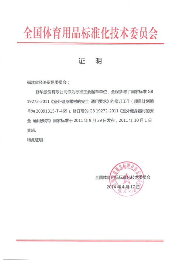 2014 GB19272-2011新国标修订证明 全国体育用品标准化技术委员会 标准定制 查看